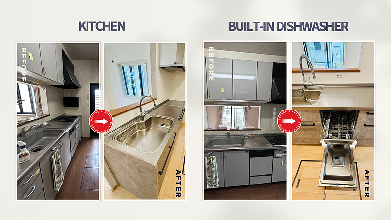 水まわりはすべて新しく。キッチンはステンレス×グレーのすっきりとした佇まいで、 パナソニック製の設備や家事動線の工夫により、使いやすさと美しさを両立しました。
