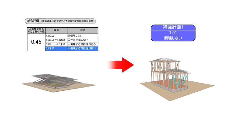 ある中古住宅では、家の形がL字で、耐震診断の数値が低い状態でした。