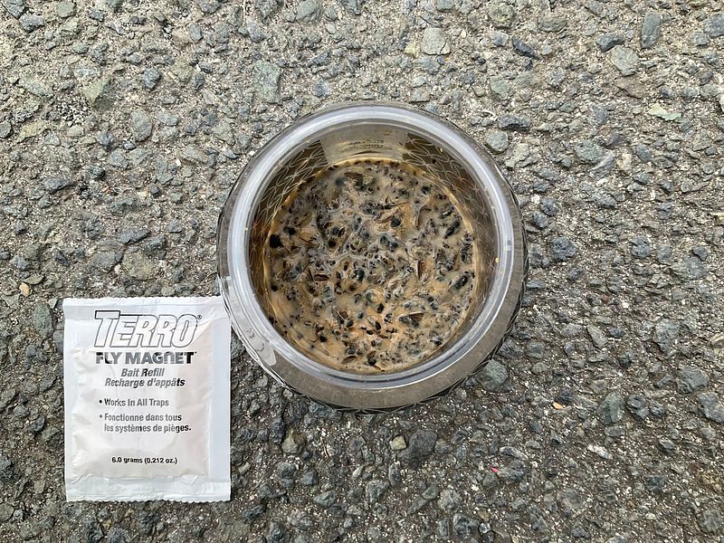 容器の中に見える黒い物体の多くがオオクロバエ等のハエ類ですが、12月も大量捕獲が続く可能性があります。