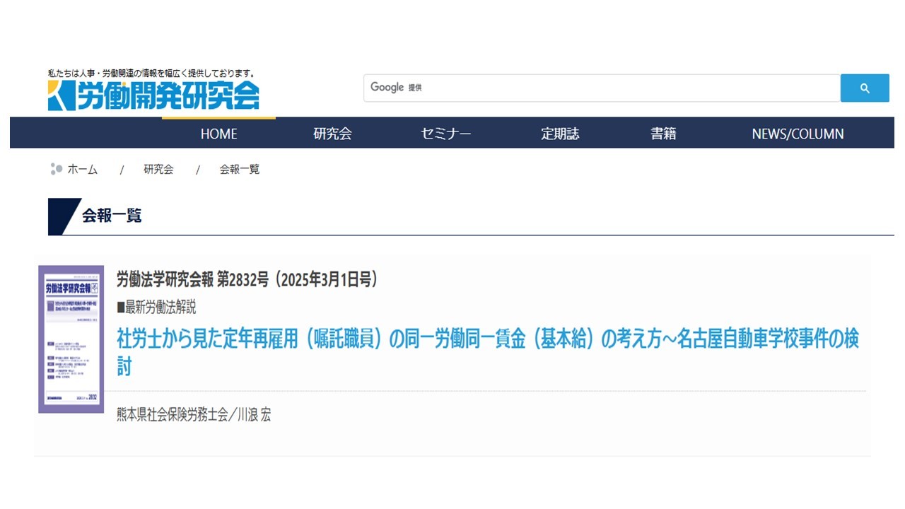 労働法学研究会報に寄稿しました。