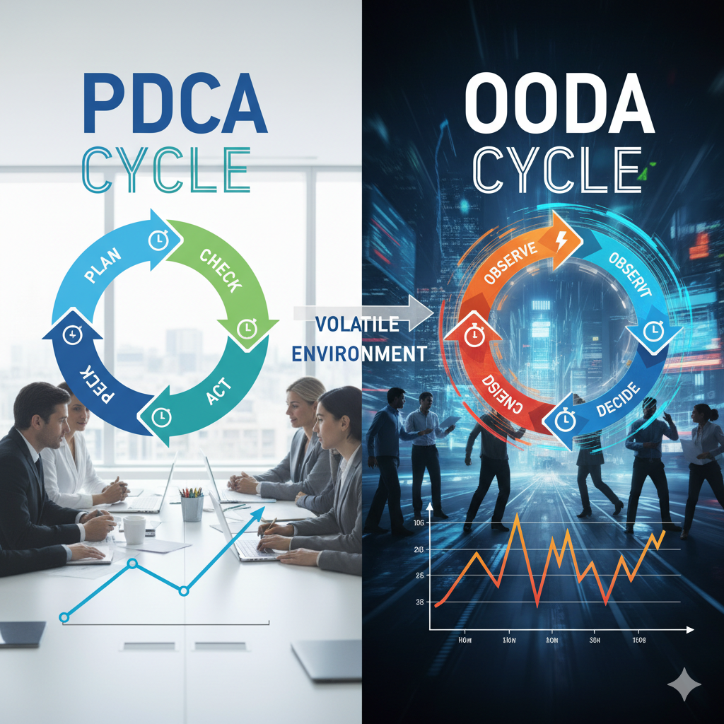 | 主な目的 | 業務の継続的改善、品質管理、標準化、効率向上 | 激しい状況下での迅速な意思決定と行動、競争優位性の確保 |