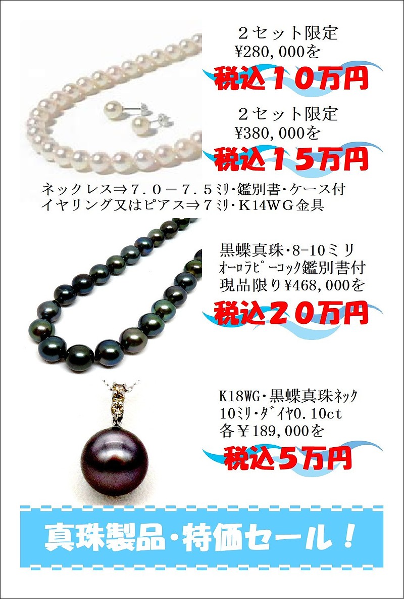 真珠製高騰の中価値ある真珠2点セットを各2セット限りですが、【10万円】と【20万円】でご用意いたしました。さらに、フォーマルにもカジュアルにもつかえる黒蝶真珠も【20万円】でご用意いたしました。気になるお品がご在位ましたら、事前に下見が出来ますので、ぜひご来店下さい。皆様のご来店をお待ちしております。
