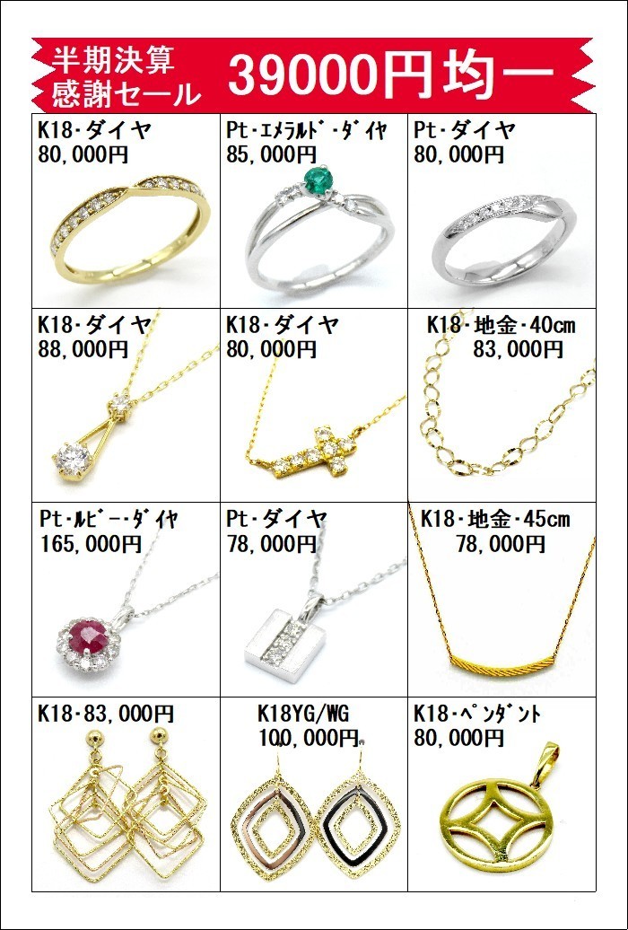 当社・半期決算・感謝のセールとして現品限りですが、【サンキューセール⇒39,000円均一セール】を開催いたします。貴金属高騰の中価値ある品を本当に特別価格でご提供させていただきます。気になるお品が、ご在位ましたら、事前に下見が出来ますので、ぜひご来店下さい。