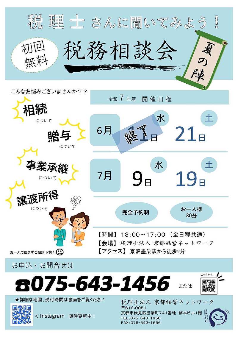さて、先日告知させていただきました「税務相談会」についてですが、残りの開催日程は6/21(土)、7/9(水)、7/19(土)の三日間となっております。既に多くの方にご予約いただいておりますがまだ参加枠はございますので、参加をご検討されている方はお気軽にお問い合わせください。