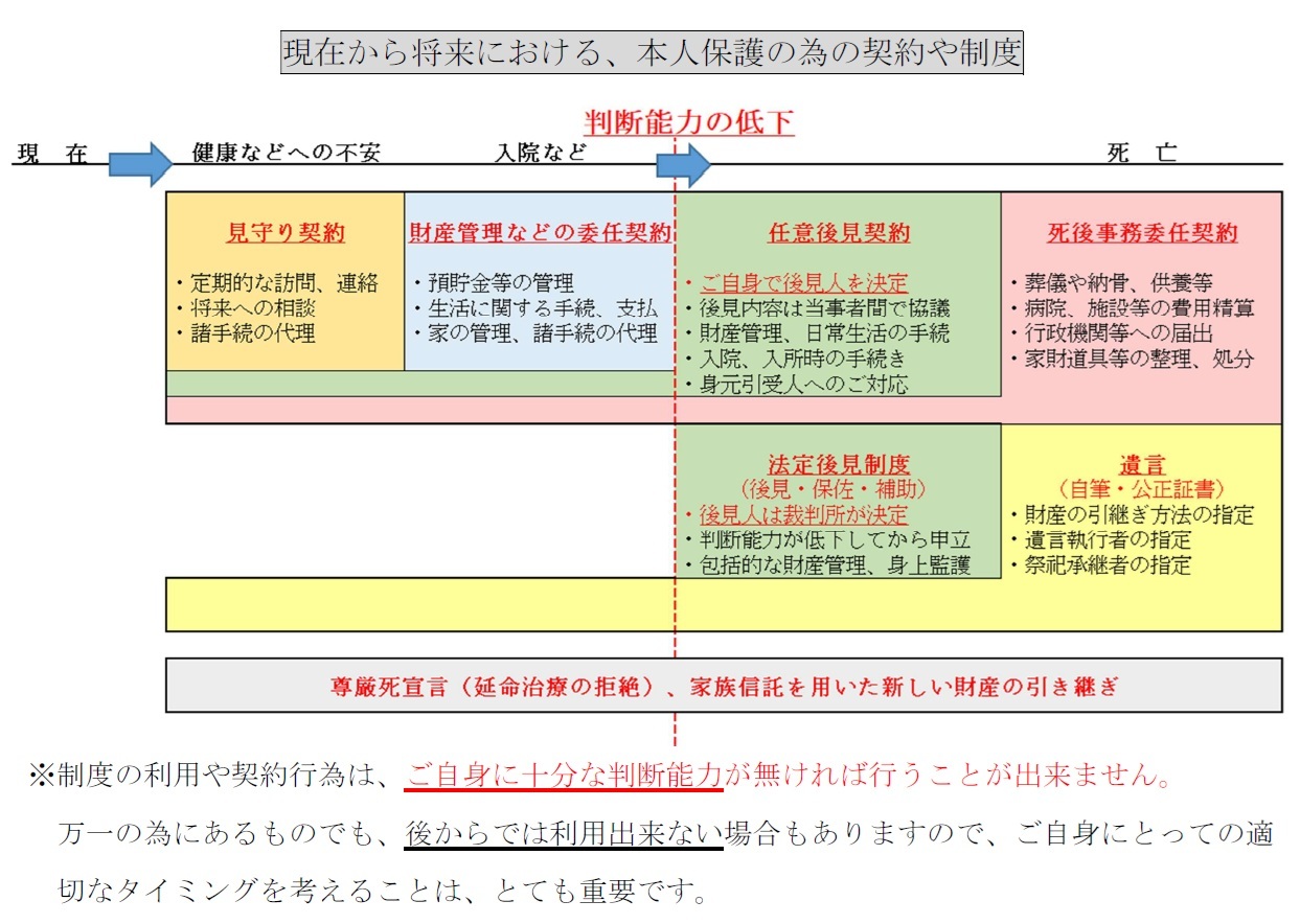 本人保護の為の契約や制度にどの様な種類があるのか、時間の経過と共に表したものが下図となります。