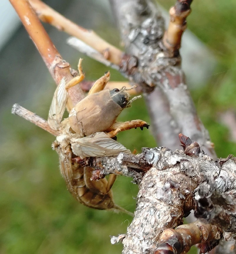 庭の桜の枝にオケラが刺さっていた。