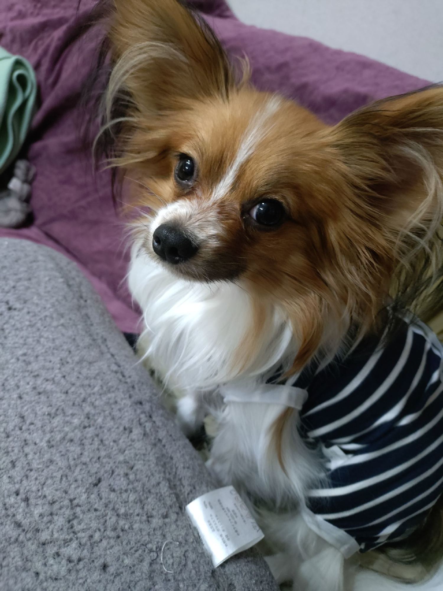 手術後おとなしかったので、去勢したことにより性格が変わったのかと思っていたところ、この術後衣を脱いだ瞬間元の暴れまくる犬に戻った。