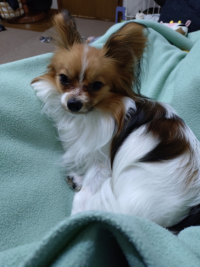 俺は眠くないのだと言っていつまでも遊ぼうとする3代目小次郎であるが、限界となり、私の足の間で寝そうになっているところである。