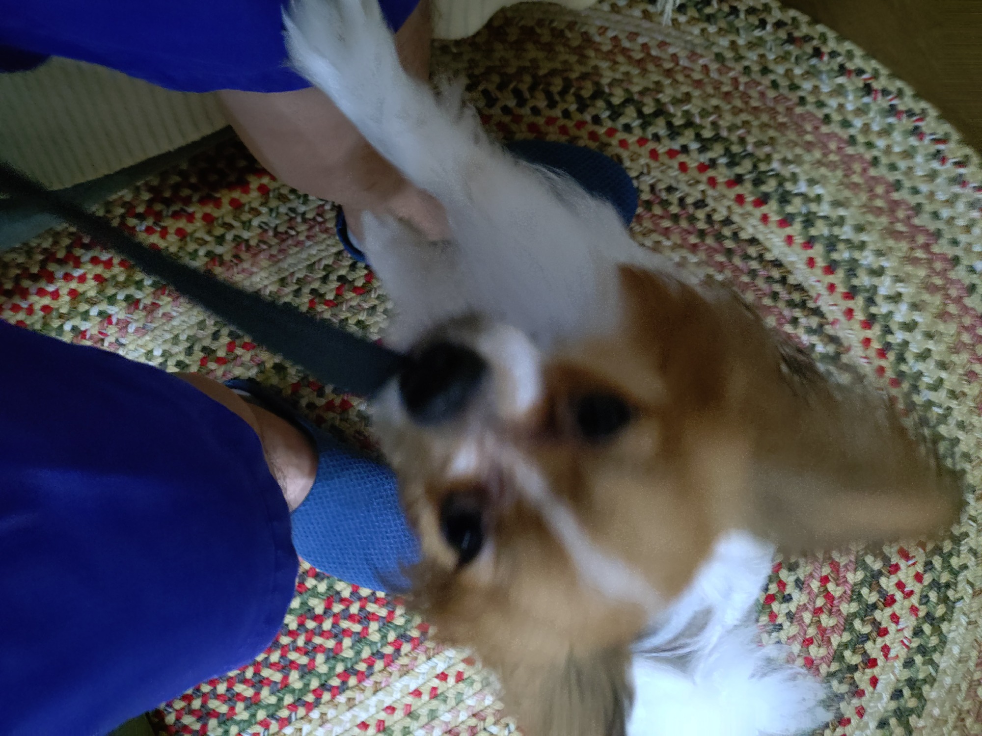 私のズボンの紐に飛びついて噛んでいる3代目小次郎である。