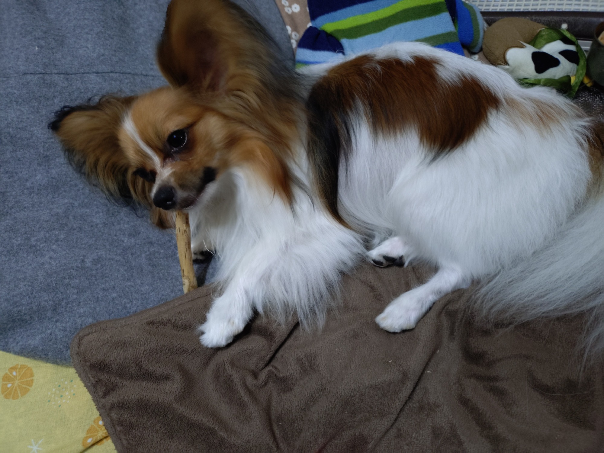 鹿の角を噛むのにあげたところ、お腹が緩くなったので、かじる木をもらってカミカミしている3代目小次郎である。