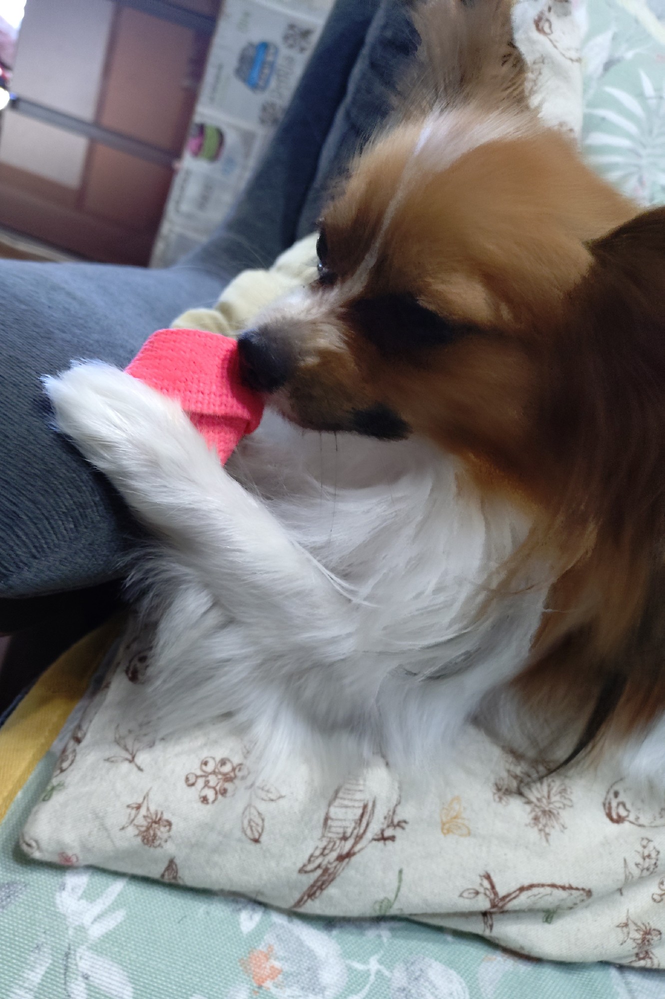 紐を丸めたものをカミカミしている3代目小次郎である。