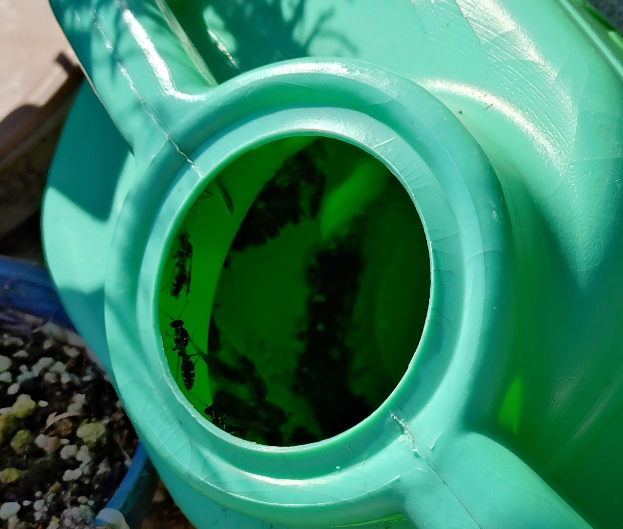 使っていないじょうろのところに小さいハチがいるということで見てみたら、中に巣を作っていた。