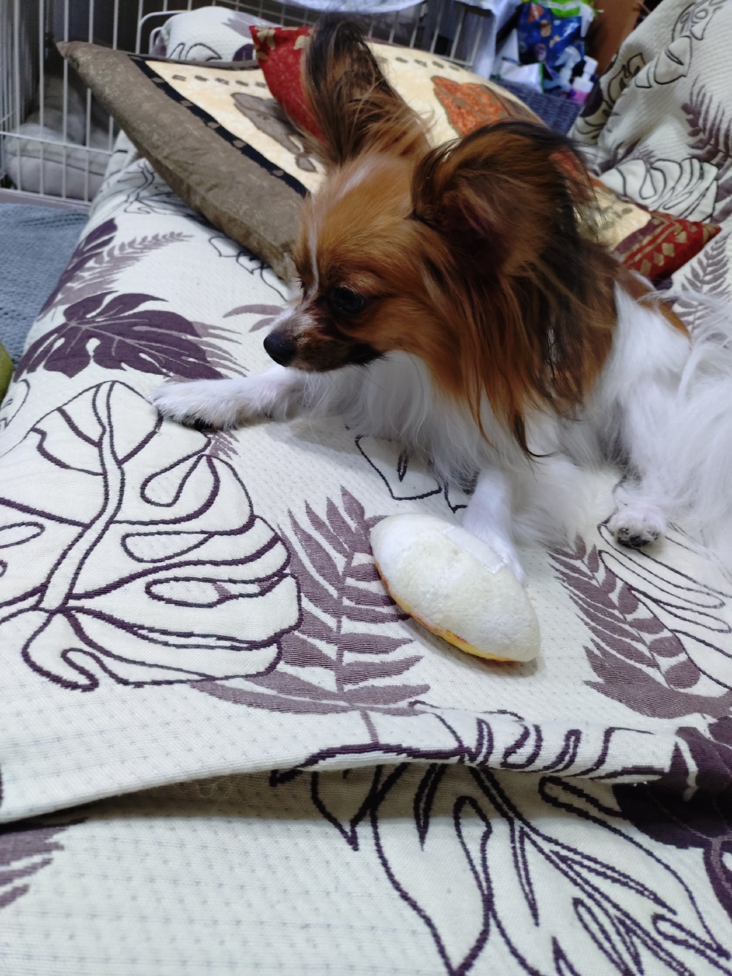 オモチャをくわえてきて、疲れたのでソファーで休憩中の3代目小次郎である。