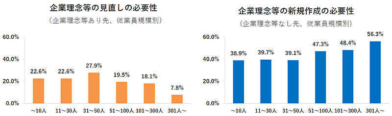 また以下グラフは、『企業理念見直しの必要性および新規作成の必要性をどう考えているか』の企業規模別データです。