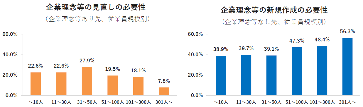 どちらにおいても、規模が拡大するにつれて企業理念保有率は上昇しています。