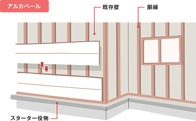 既存壁の上から金属サイディングを重ね貼りする方法です。既存壁をそのままにすることで撤去費用が抑えられます。新設サイディングを金属サイディング(アルミ)にすることで 窯業系サイディングに比べて重量もとても軽く、住まい構造(柱、梁など)への負担が少なく、万一の大地震でも倒壊の可能性を軽減します。
