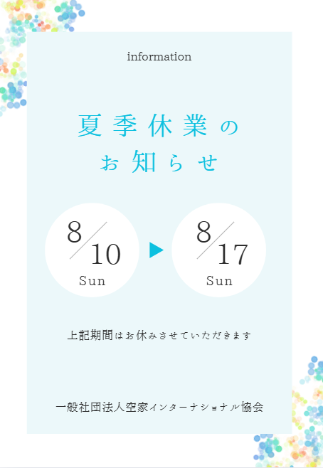 上記期間に頂いたお問い合わせにつきましては、8月18日(月) 以降のご返答とさせていただきますこと、ご理解いただけましたら幸いです。