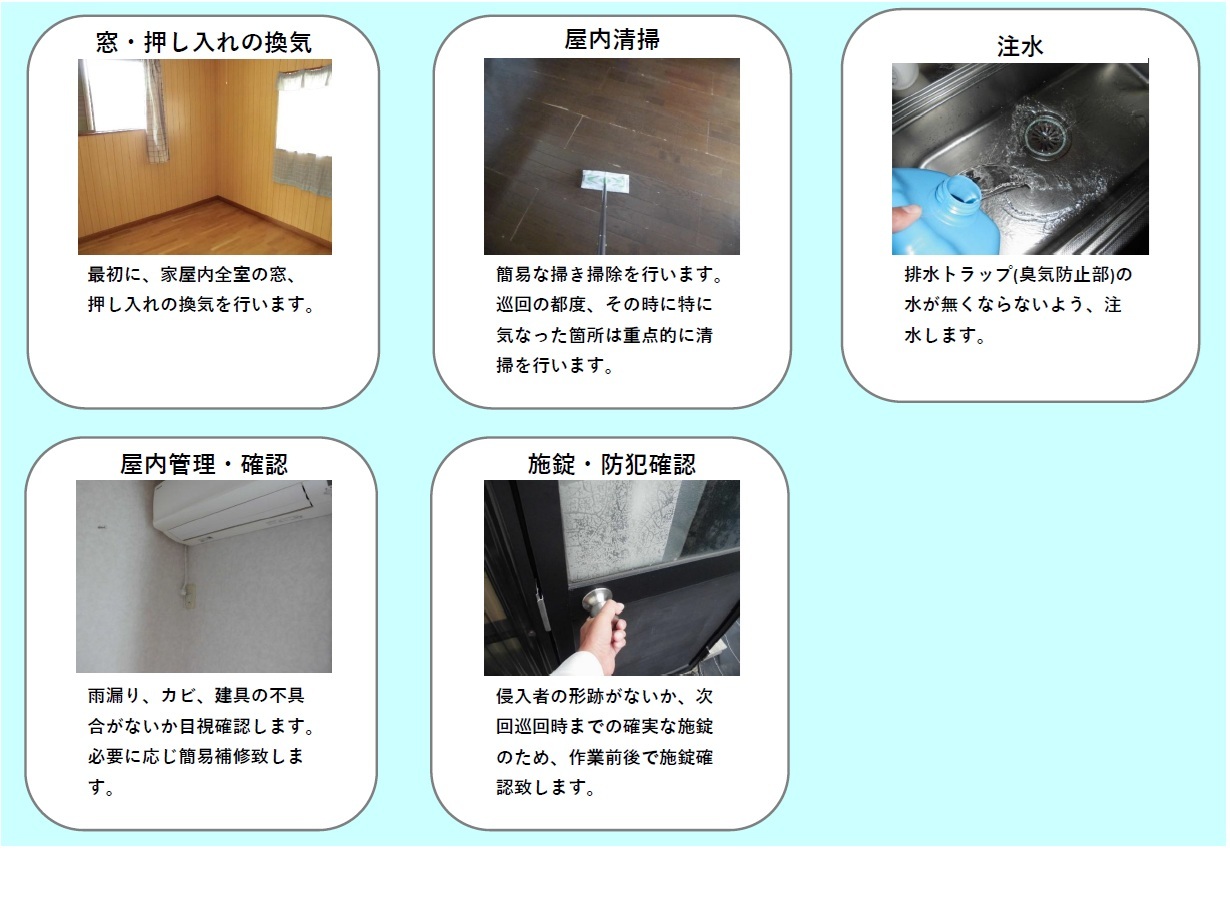 エリート、プレミアム、スタンダードは家屋内も管理致します。都度、換気・注水も行いますので、湿気やカビ発生の抑制、雨漏り等の家屋内のトラブルにも即座に対応することができ、長期間ご自宅を空けられる方には大変おすすめです。