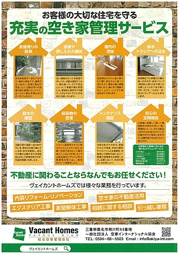 所有者様に代わって1カ月に1~2度契約物件を訪れ、老朽化を防ぐ目的で巡回します。物件の現状確認、屋内屋外の簡単な清掃、敷地内の雑草除去や破損の応急処置も行いますので、見た目も美しく保たれ、また、定期的に訪れますので、防犯面にも絶大な効果となります。現在ご契約中のお客様からは、...
