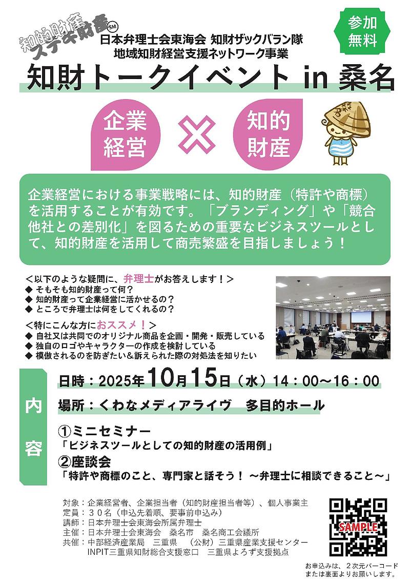 日本弁理士会東海会は、桑名商工会議所と共催で「知財トークイベントin桑名」を初開催します。