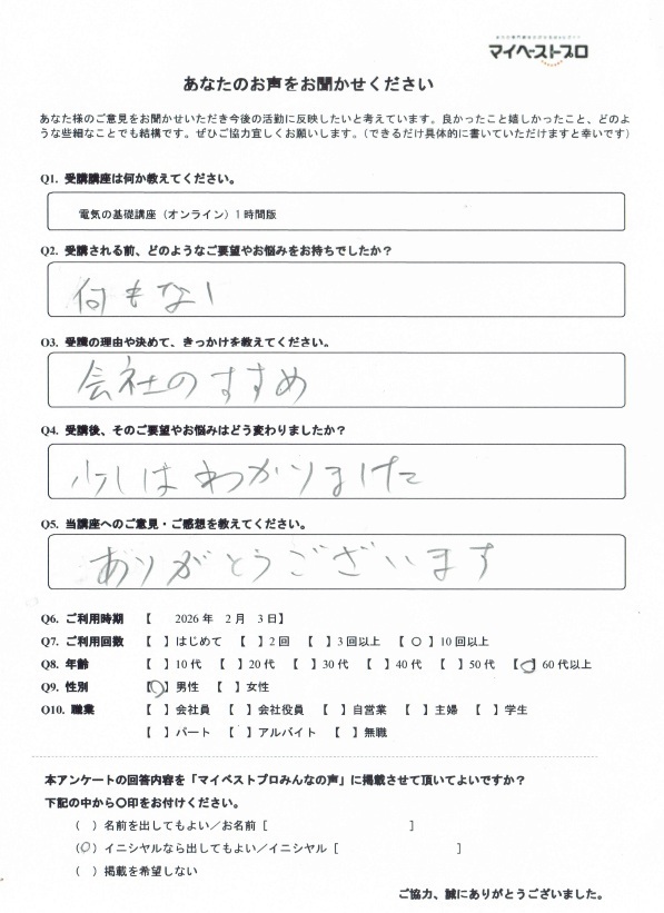 ※ 回答は原文のままです。●受講される前、どのようなご要望やお悩みをお持ちでしたか? 回答:何もなし●受講の理由や決めて、きっかけを教えてください。 回答:会社のすすめ●受講後、そのご要望やお悩みはどう変わりましたか? 回答:少しはわかりました●当講座へのご意見・ご感想を教えてください。 回答:ありがとうございます