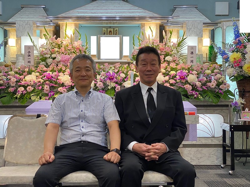 浄土宗・報恩寺御住職様のお導きにより家族葬を執り行うお手伝いをさせて頂きました謹んで故人のご冥福をお祈り申し上げます・通夜終了後に喪主さんと写真撮影しました互いに自営業として日々張り切って頑張ってます・・・於・仙台家族葬会館メモワード