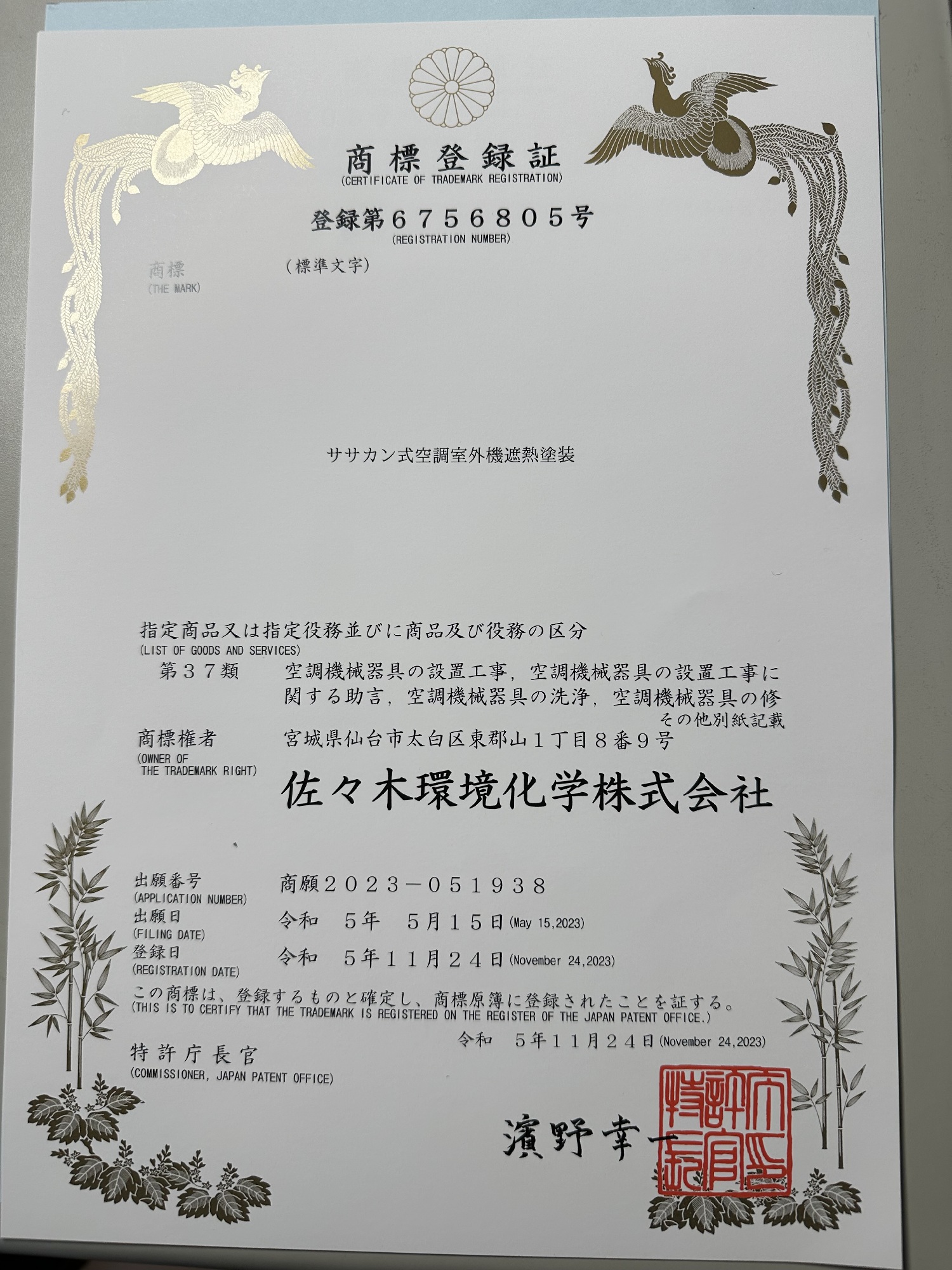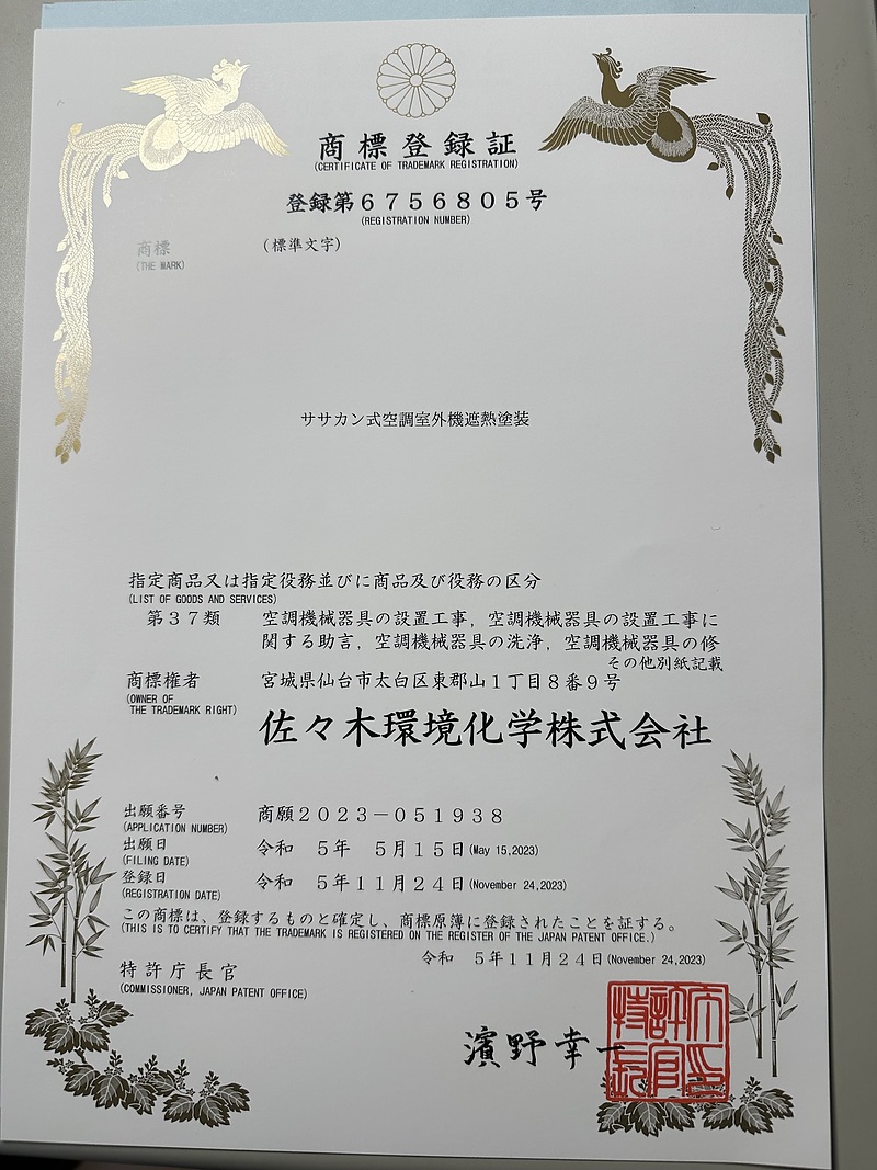 商標登録 第756805号 ササカン式空調室外機遮熱塗装