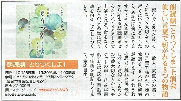 10月28日 ㈰ に せんだいメディアテークで上演の 朗読劇 「とりつくしま」