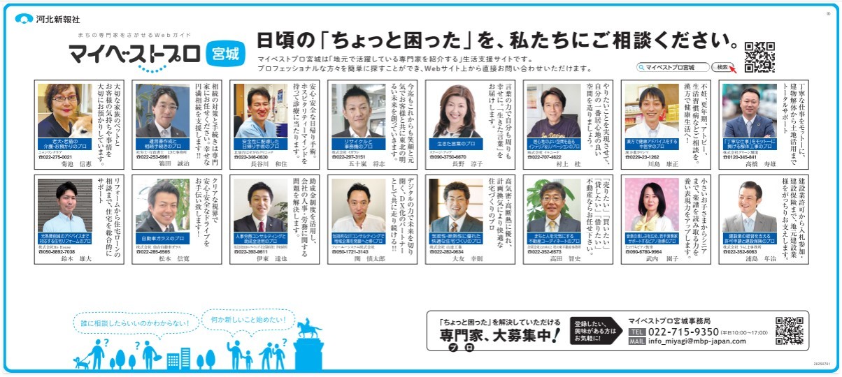 2025年8月25日(月)河北新報に「マイベストプロ宮城」の顔写真付き新聞広告が掲載されました!