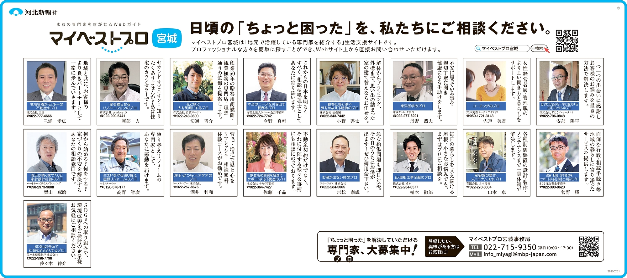 2025年8月30日(土)河北新報に「マイベストプロ宮城」の顔写真付き新聞広告が掲載されました!