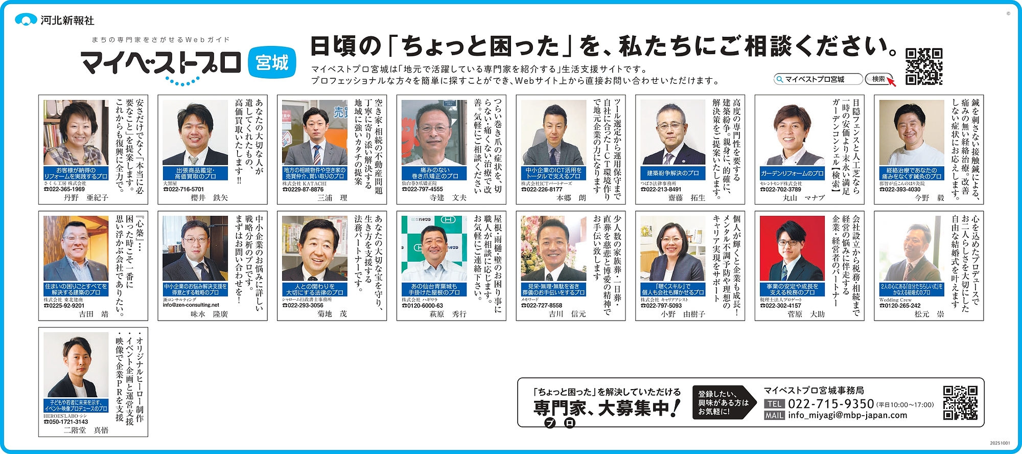 2025年10月28日(火)河北新報に「マイベストプロ宮城」の顔写真付き新聞広告が掲載されました!
