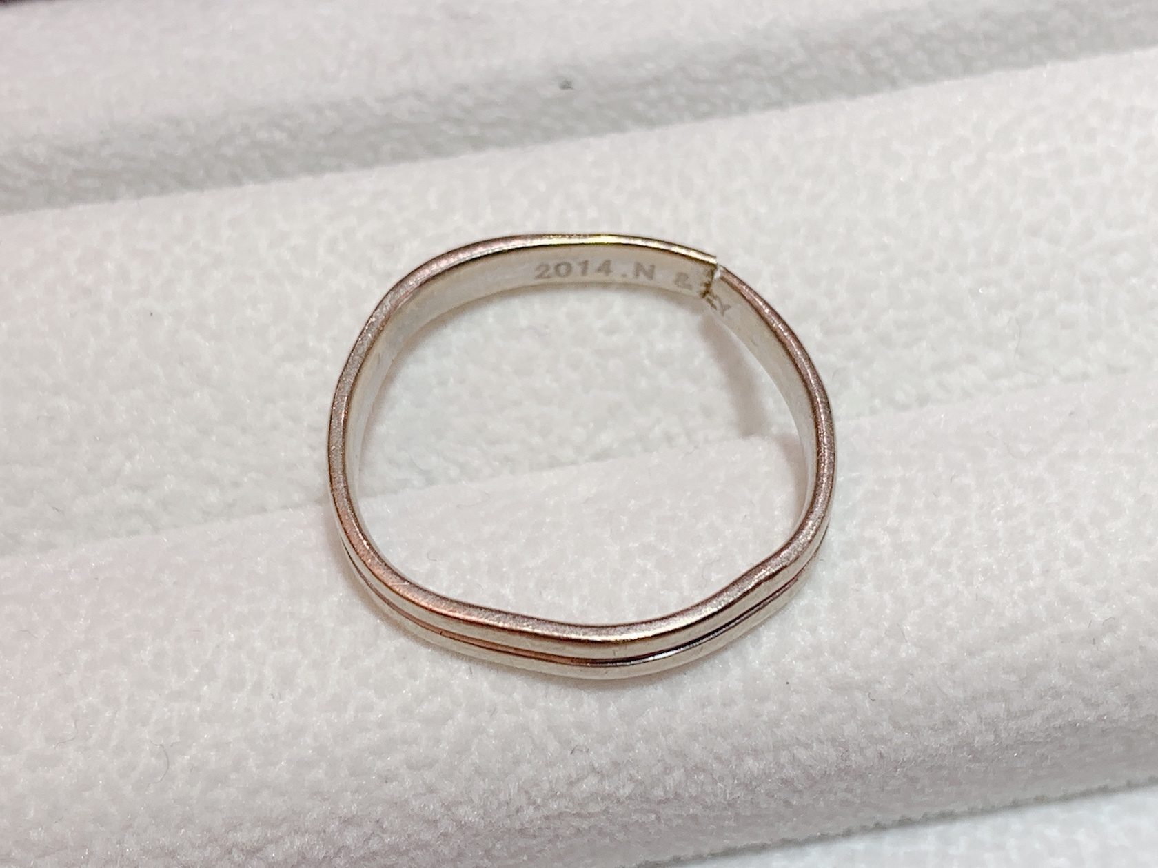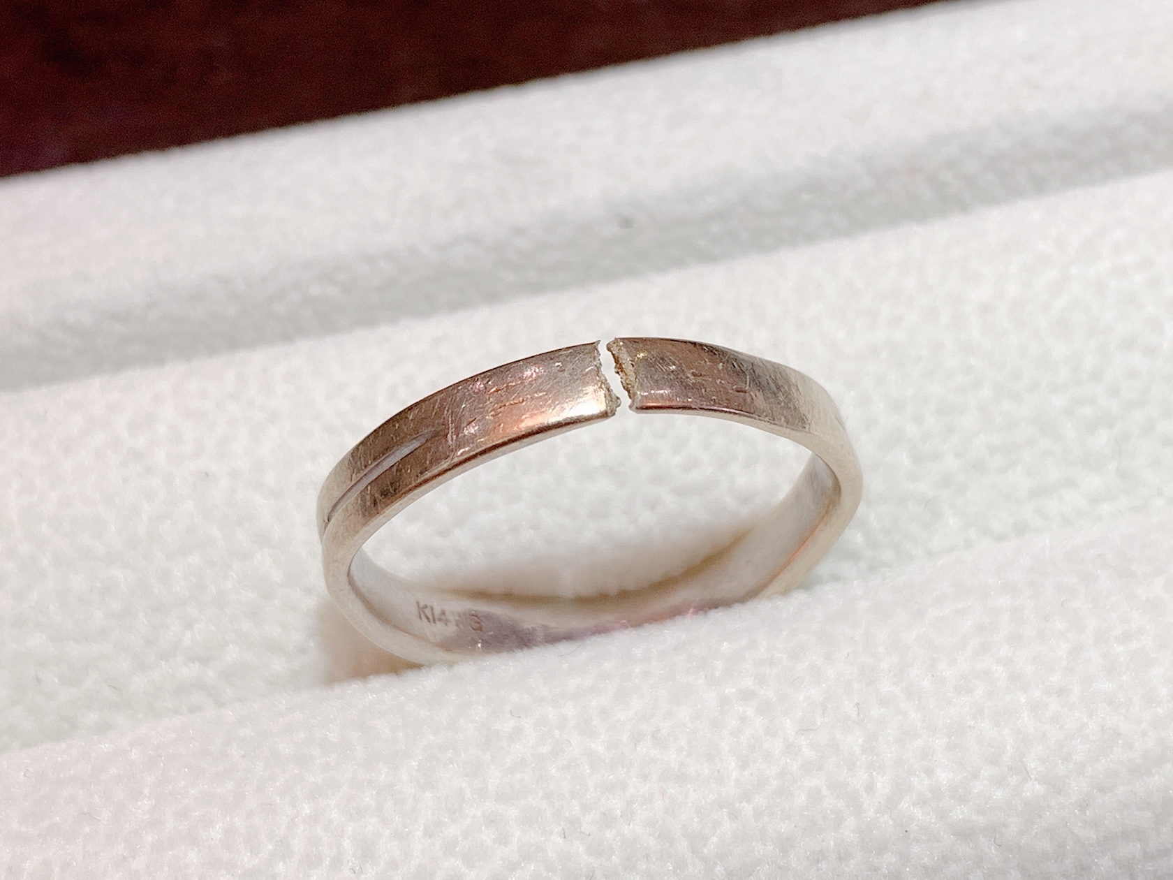 「他店で購入した結婚指輪です。サイズ直しをしたんでしょうか?指輪が切れたんです。結婚指輪だからずっとつけっぱなしで使っていたら、こんなに変形もしちゃって。これって修理することできますか?」