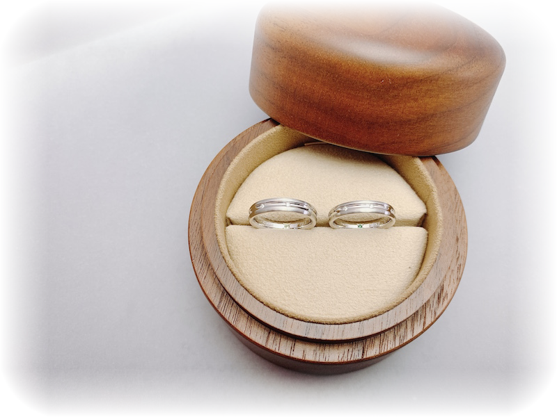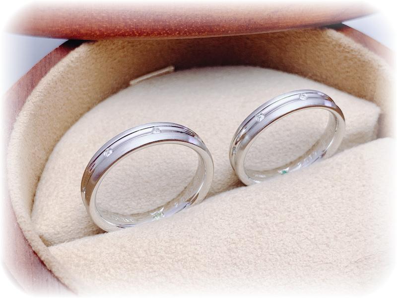 出来上がりを二人でご覧になって「このつや消しと鏡面、そしてダイヤモンドのデザインがとてもかっこいいですね。年齢にふさわしいデザインの結婚指輪を手にすることができました。ありがとうございました」と、喜んで頂きました。