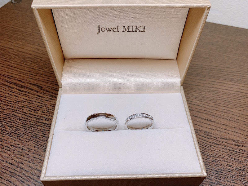 「会社の同僚の結婚指輪は、購入して1年も経たずに変形してしまい、彼は指輪をつけていません。自分たちはずっと結婚指輪はつけたいと考えているので、ずっとつけられる丈夫な結婚指輪を探していたら、ジュエルミキさんのサイトにたどり着きました。指輪を見せてください」と、お二人でご来店されました。