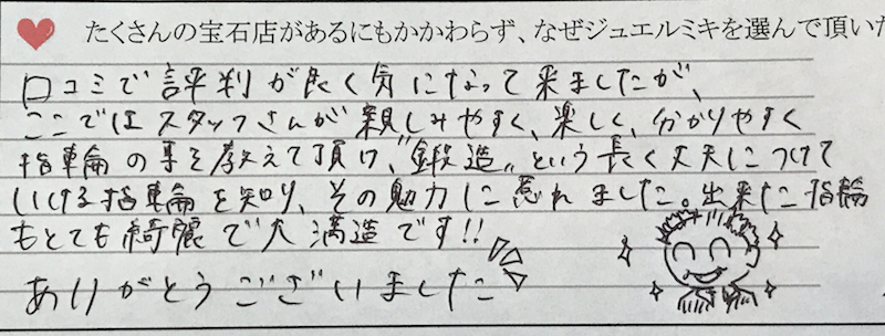 「口コミで評判が良く、気になって来ましたが、ここではスタッフさんが親しみやすく、楽しく、わかりやすく指輪の事を教えて頂け「鍛造」という長く丈夫につけていける指輪を知り、その魅力に惹かれました。できた指輪もとても綺麗で大満足です!ありがとうございました」と、ありがたいコメントを頂きました。
