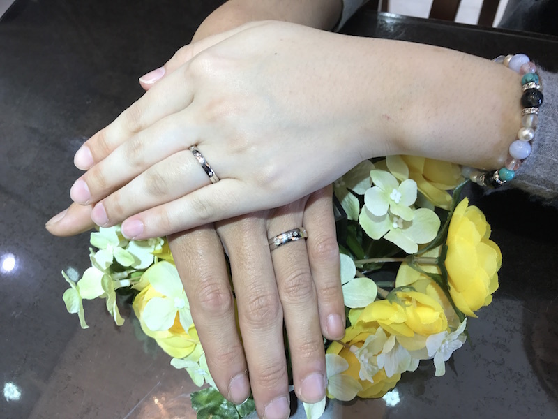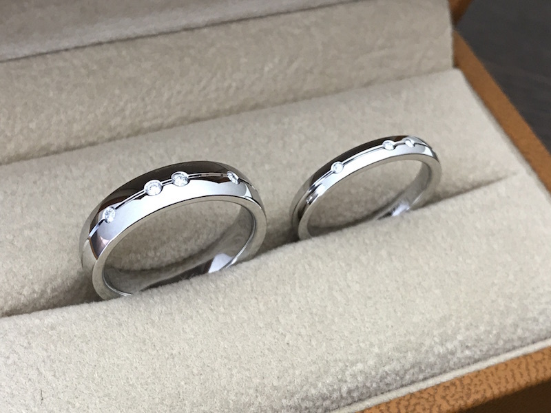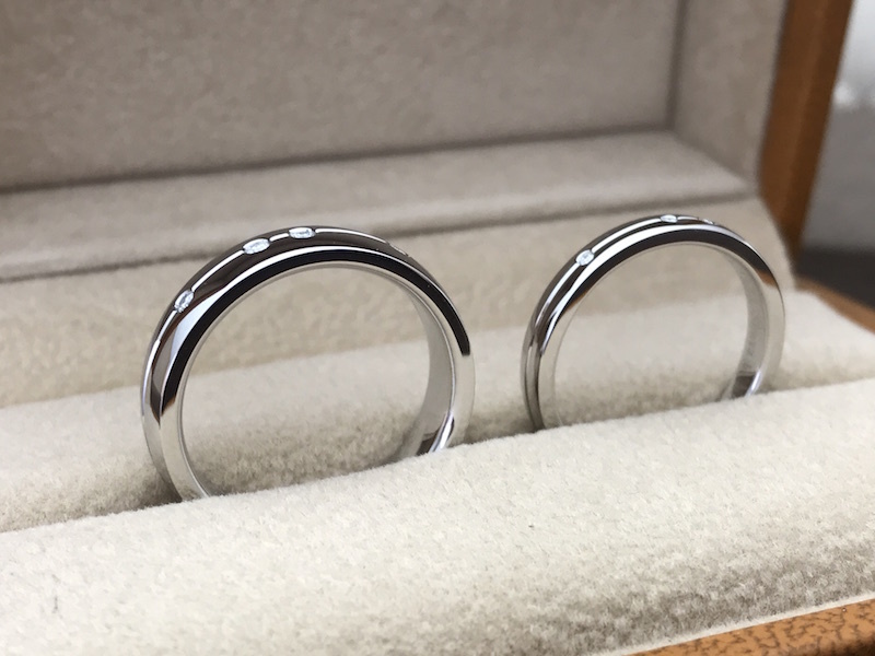メンズはPt950幅5mm、サイズ16号鏡面加工&ランダムダイヤモンドセッティングで、レディースはPt950幅3mm、サイズ12号鏡面加工&ダイヤモンドランダムセッティングでオーダーメイドとなりました。