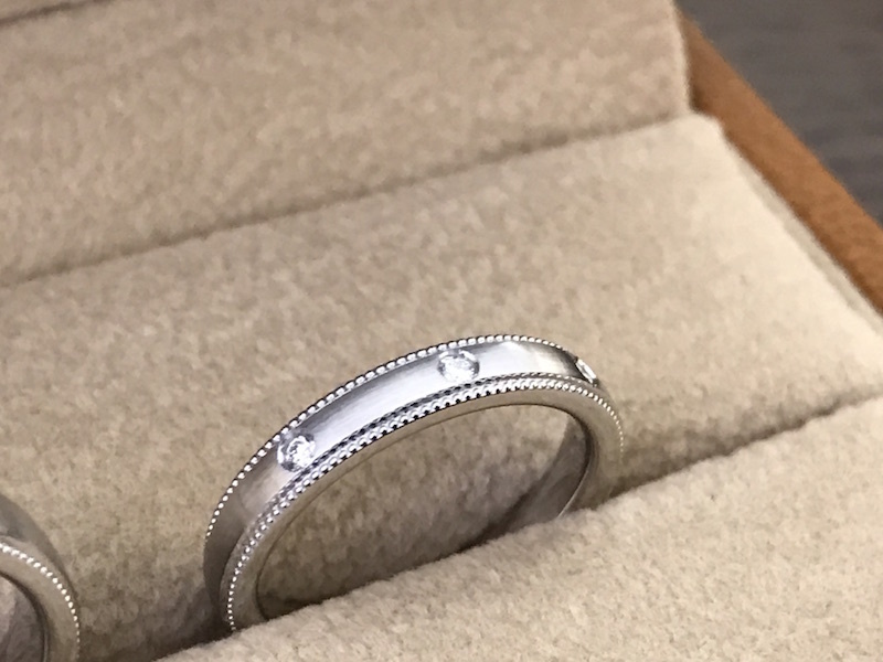 メンズはPt950幅4mm、サイズ10号ヘアライン加工&ミル打ち&ブラックダイヤモンド3石セッティングで、レディースはPt950幅3mm、サイズ6号ヘアライン加工&ミル打ち&ホワイトダイヤモンド3石セッティングでオーダーメイドとなりました。