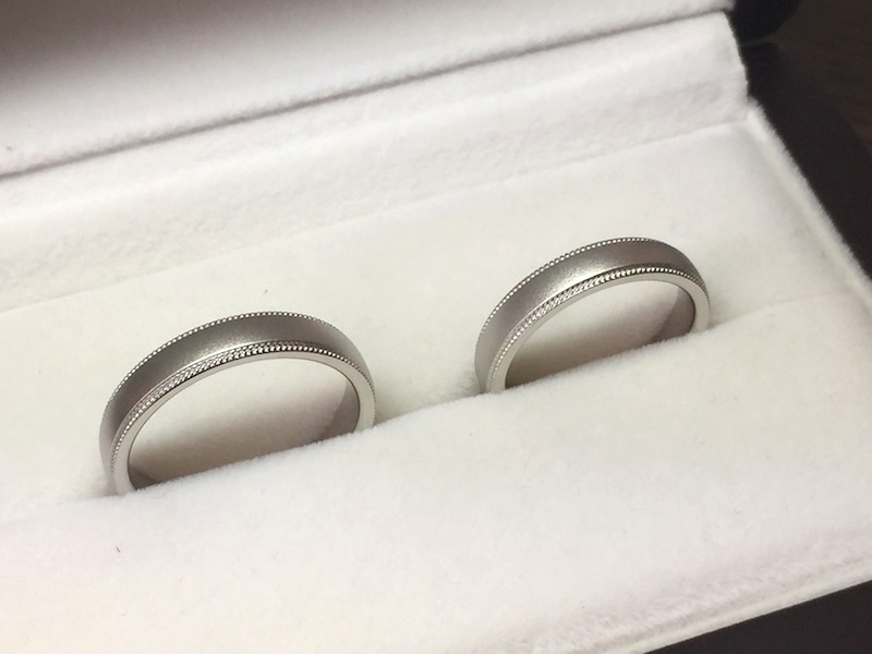 メンズはPt950幅4mm、サイズ16.5号つや消しマット加工&ミル打ちで、レディースはPt950幅4mm、サイズ10.5号マット加工&ミル打ちでオーダーメイドとなりました。