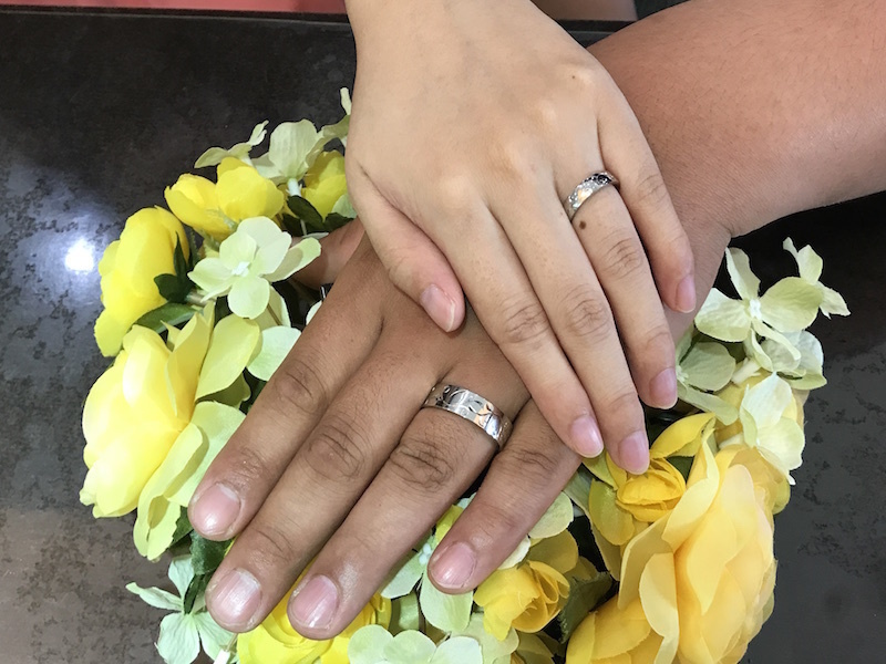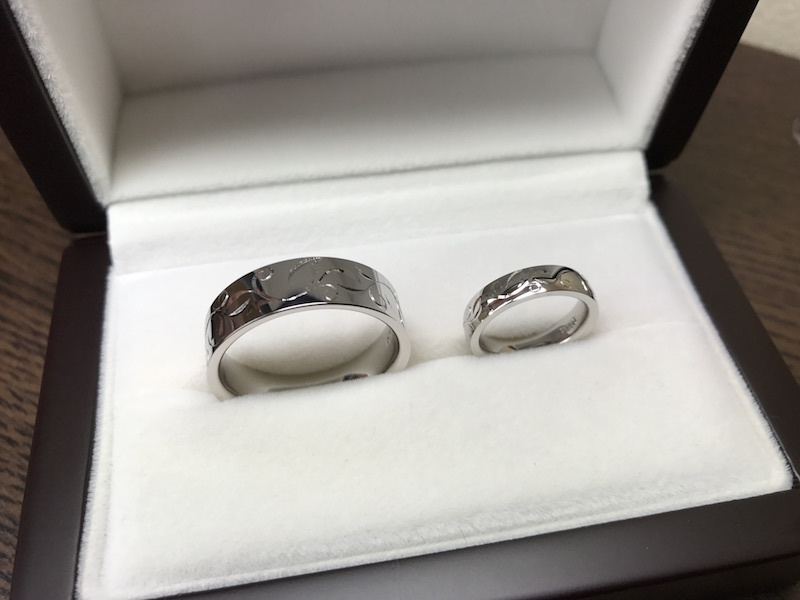 二人とも表面には手彫り(ハンドカービング)をデザインし、この世にたった1つの、誰ともかぶらないオリジナル結婚指輪となりました。