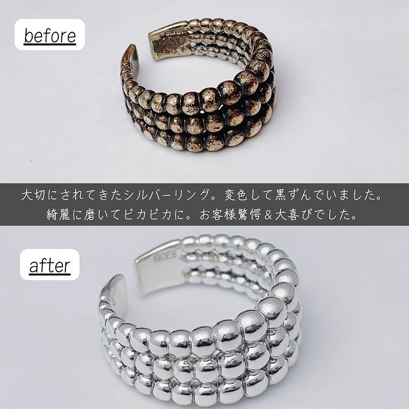 大切にされてきたシルバーリング。真っ黒に変色していました。綺麗に磨いてピカピカにしました。
