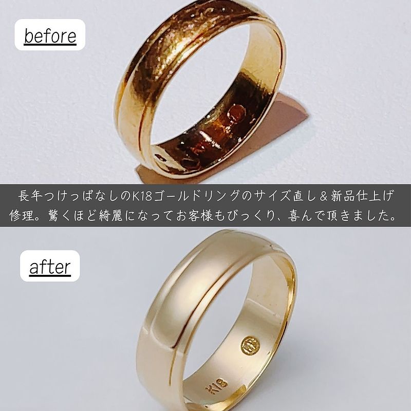 長年つけっぱなしだったK18ゴールドリングのサイズ直し&新品仕上げ修理。