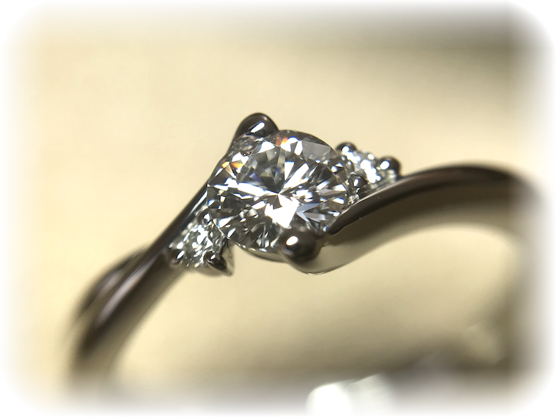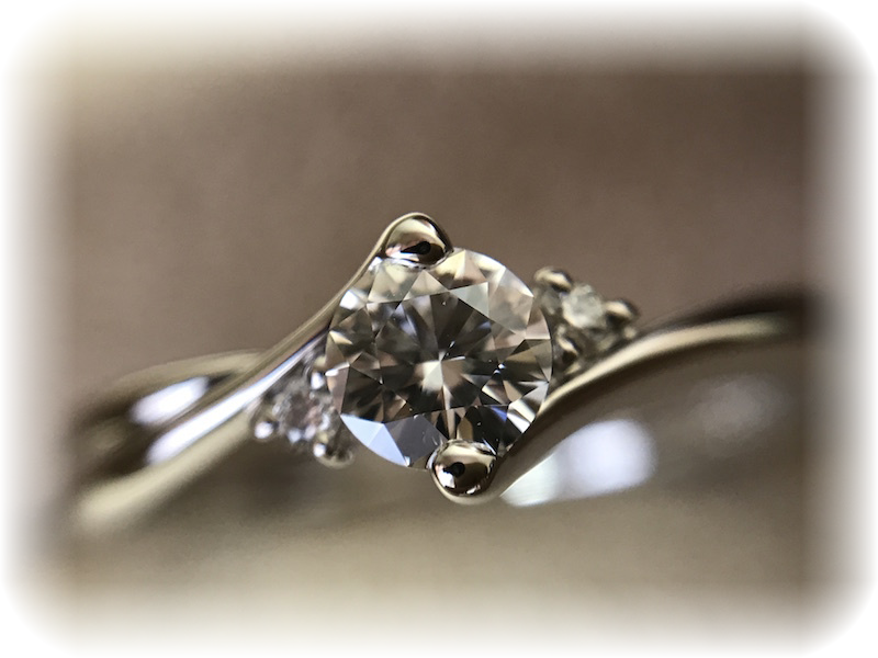 ティファニータイプのような立爪ではなくフラットなデザイン、ダイヤモンドの輝きの強さ、サイズが0.25号刻みでオーダーができることが決め手でした。