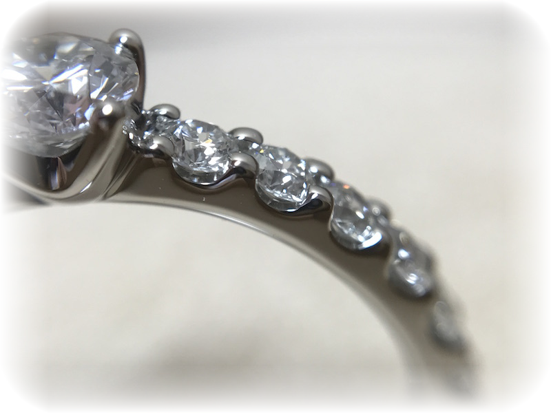 だから一文字のラインがとても綺麗ですし、そのメレダイヤモンドも全てエクセレントカットのダイヤモンドを使用していますからギラギラしています。まさにエタニティタイプエンゲージリングの最高品質です。