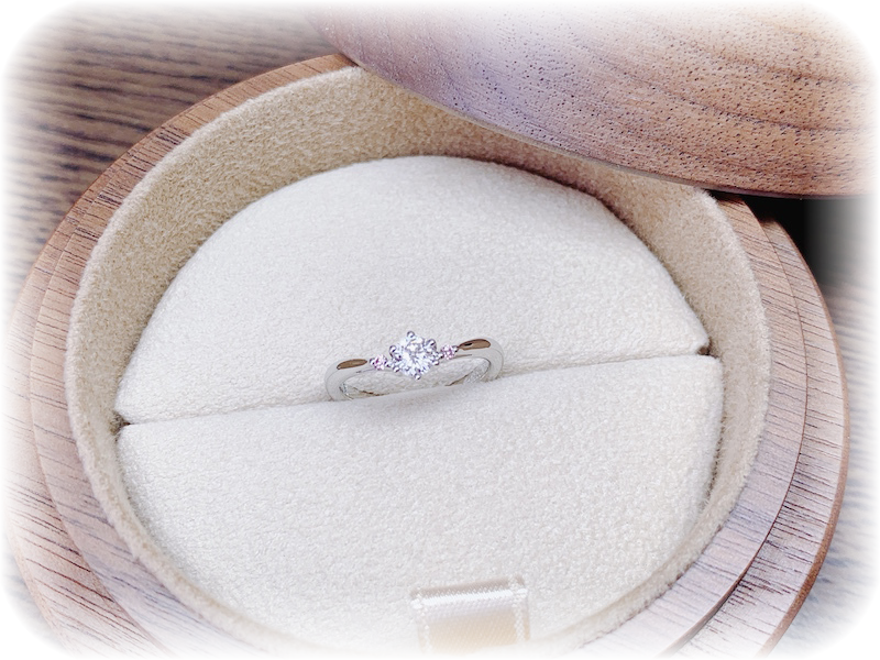 「センターがピンクダイヤモンドだと、ものすごい価格がしますので、センターは通常の無色透明なダイヤモンド、その両脇に留める小さなメレダイヤモンドをピンクダイヤモンドにされたらどうですか?むしろその方がとても可愛く仕上がりますよ」とアドバイスをさせて頂き、「なるほど、それなら!」ということで両サイドピンクダイヤモンドをあしらった婚約指輪にすることになりました。