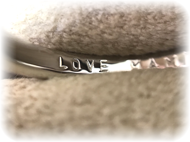 そして婚約指輪の内側には「LOVE 彼女名」を打刻しました。なかなか口では言えない「心から愛してるよ!」を刻みました。プロポーズの時にもこのことは黙って贈るとのこと。彼女が自宅に帰ってこの婚約リングを眺めた時、内側の「LOVE」に気づいてくれたら嬉しいな。と話していました。彼は本当に素敵な男前男子でした。