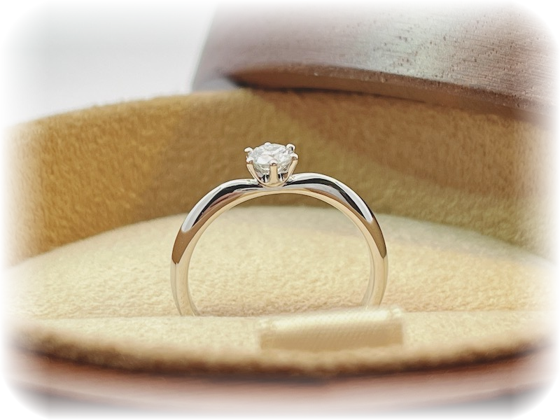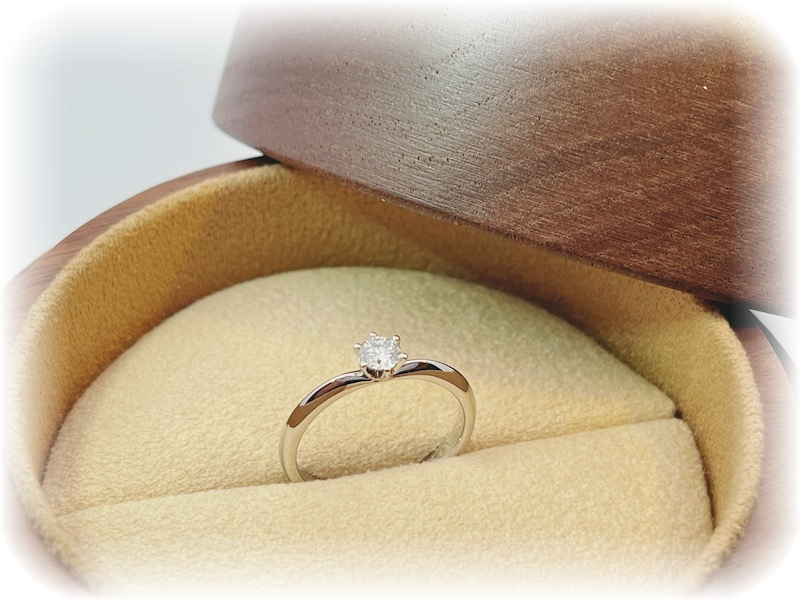 出来上がりをご覧になって「素敵なプロポーズリングが完成しましたね。ダイヤモンドも綺麗だし、オーダーメイドで作れる婚約指輪はやっぱりいいですね。彼女が喜んでくれると本当に嬉しいです。サプライズ、頑張ってきます。ありがとうございました」と、喜んで頂きました。