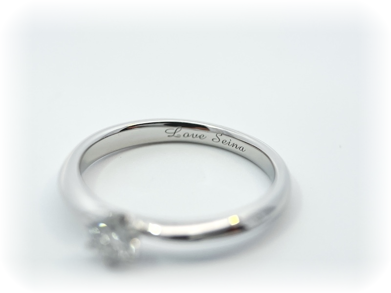 婚約指輪の内側には「LOVE 彼女名」を打刻しました。なかなか口では言えない「心から愛してるよ!」を刻みました。プロポーズの時にもこのことは黙って贈るとのこと。彼女が自宅に帰ってこの婚約リングを眺めた時、内側の「LOVE」に気づいてくれたら嬉しいな。と話していました。彼は本当に素敵な男前男子でした。
