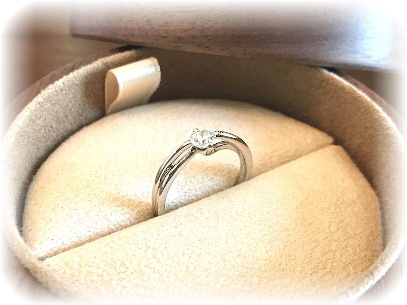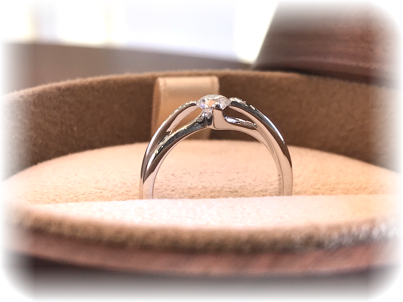 出来上がりをご覧になって「この個性的なデザインがとても気に入ってこちらをオーダーメイドしましたが、出来上がりを見てやっぱりこれが私には一番合ってると、改めて感じました。すごく素敵で大好きなデザインです。このエンゲージリングに出会えることができてとても幸せです」と、喜んで頂きました。