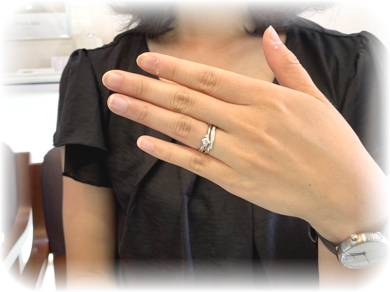 華奢な彼女さんの指に婚約リングと結婚リングを2本重ねづけでつけても、太すぎない、ボリュームが多すぎないデザインに絞ってハーモニーをとても気に入って頂きました。