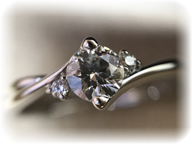まずはダイヤモンドのみでサプライズプロポーズをされて、その後彼女とご来店されて婚約指輪のデザインを決めてオーダーメイドしました。
